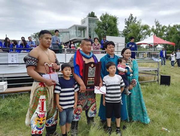 Nobuo Fukataki (left), deputy director of Inner Mongolia Goodwill Exchange Association in Niigata, and Sun Dagang (middle), consul general of China’s Consulate in Niigata, give an award to Qingzhao Rigetu, first prize winner of the Third Mongolian Wrestling Contest held in Niigata. [Photo/nmgsports.gov.cn]