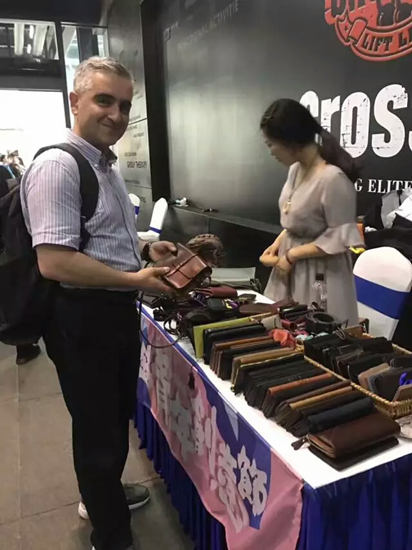 A man shows the leather wallet he likes. The wallets are all made by hand. [Photo provided to chinadaily.com.cn]