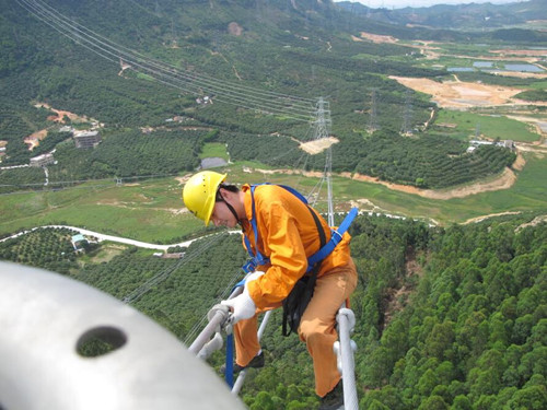 | He Teng, an electric power line patroller from China Southern Power Grid inspects electricity lines high up in the air. [Photo provided to chinadaily.com.cn] |