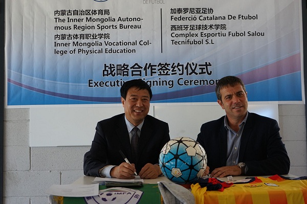 The signing ceremony takes place for a memorandum of understanding (MoU) between Inner Mongolia and Catalonia. [Photo/nmgsports.gov.cn]