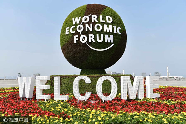 A plant statue, welcoming World Economic Forum participants, is unveiled near the International Conference Center at Dalian Donggang Business District in Dalian, Northeast China's Liaoning province, June 25, 2017. [Photo/VCG]