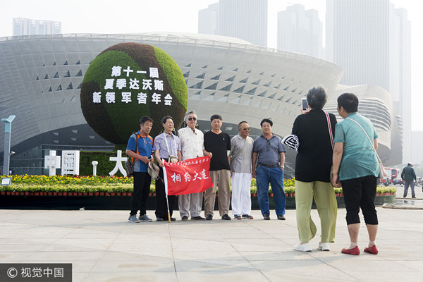 Senior visitors take a photo in front of the Dalian International Conference Center in Dalian, Northeast China's Liaoning province, June 17, 2017. [Photo/VCG]