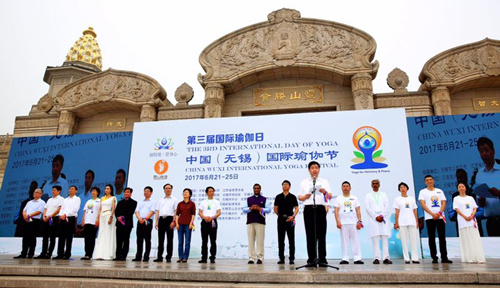 Jointly hosted by China Council for the Promotion of International Trade Wuxi Branch, the sports bureau of Wuxi, and Consulate General of India in Shanghai, the 2017 China Wuxi International Yoga Festival marked International Yoga Day, which falls on June 21 and is designed to promote the benefits of yoga.