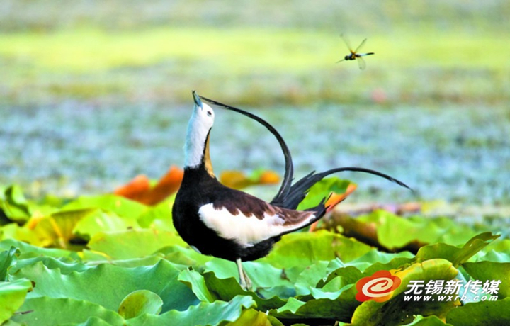 A female pheasant-tailed jacana shows off her feathers. [Photo by Bao Jianxin / wxrb.com]