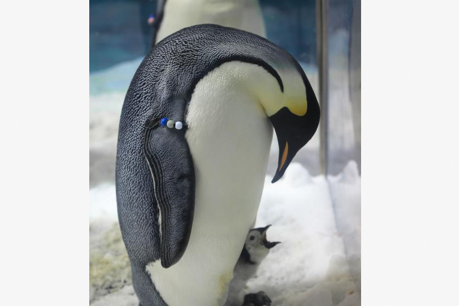 A baby emperor penguin peeks out of the pouch of its father at Chimelong Ocean Kingdom in Zhuhai, South China's Guangdong province. [Photo provided to chinadaily.com.cn]