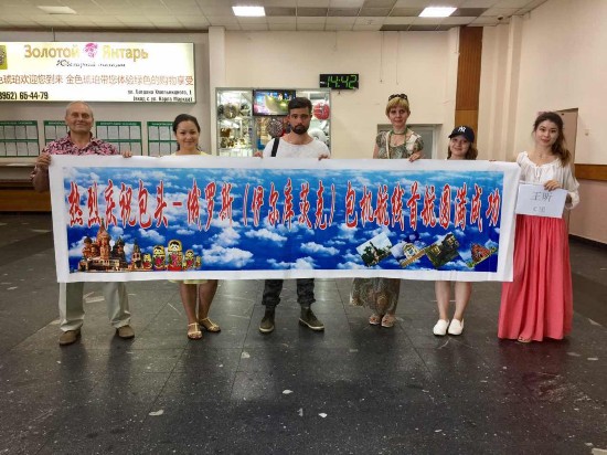 | Russians give tourists from Baotou, Inner Mongolia autonomous region, a warm welcome with bread and salt, a traditional way to welcome guests in some cultures, June 24. [Photo/nmgnews.com.cn] |