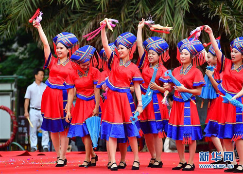 | A group of young Yao women perform traditional Yao dancing to celebrate the Zhuzhu Festival. [Photo by Huang Xiaobang/Xinhua] |