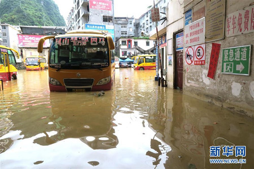 | A bus station in Fengshan is flooded. [Photo by Zhou En'ge/Xinhua] |