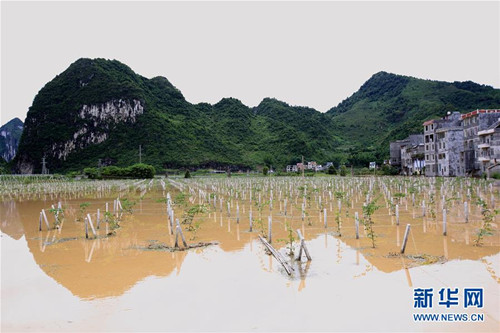 | A farmland in Jiujia village, Fengshan, is flooded from the continuous rainstorm. [Photo by Zhou En'ge/Xinhua] |