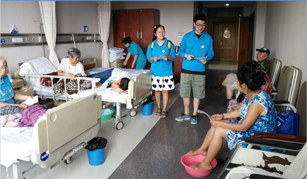 | Wanqing volunteers visit with patients and their families at a hospital. [Photo/cnjiwang.com] |