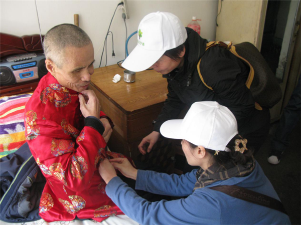 | Wanqing volunteers help a senior get dressed. [Photo/cnjiwang.com] |