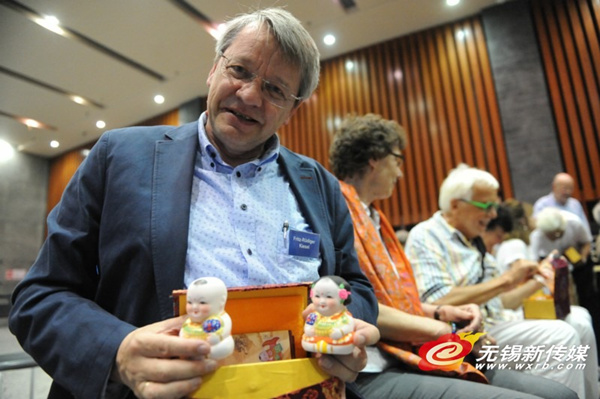 | A German visitor shows off a pair of Huishan clay figurines presented by the local event host organizer at a welcome fest held in Wuxi, East China's Jiangsu province on July 2. [Photo/wxrb.com] |
