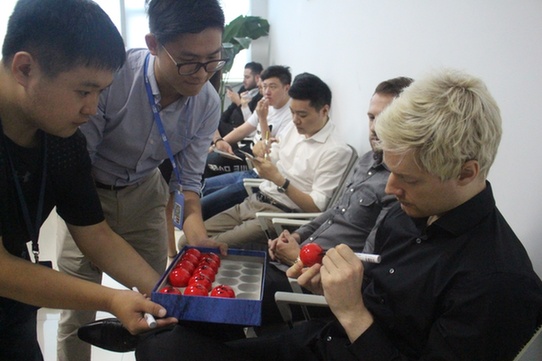 Australian snooker star Neil Robertson (right) sign autographs for fans in Wuxi on July 2.[Photo by Pan Qi/China Daily] |