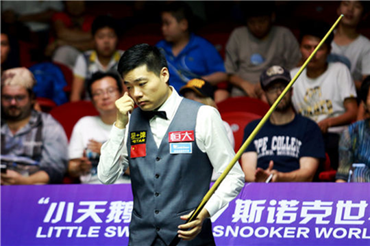 | Ding Junhui from the China A team considers his next move during his match against Germany in the 2017 Snooker World Cup in Wuxi, China, on July 4. [Photo provided to chinadaily.com.cn] |