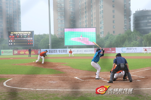 | The Jiangsu Baseball Team competes with the Fubon Bulls from Taiwan in the group stage of the cross-Straits baseball league in Wuxi on June 23. [Photo/wxrb.com] |
