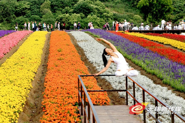 A white leotard-garbed yoga enthusiast adds to the beauty of the flower fields. [Photo/wxrb.com]