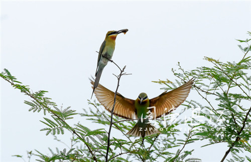 A male bee-eater catches insects for his spouse. [Photo by Xu Chengwen/yinsha.com]