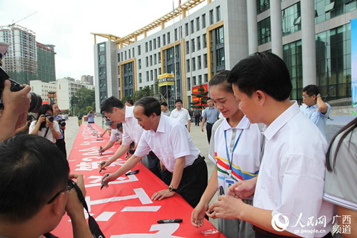 | Local residents and officials sign their names on a banner with an anti-drug slogan to express their support and wish for a drug-free society. [Photo/gx.people.cn] |