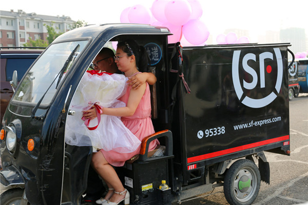 Li and Yang get on the electric tricycle. [Photo by Zi Mu and Liu Na/chinadaily.com.cn]