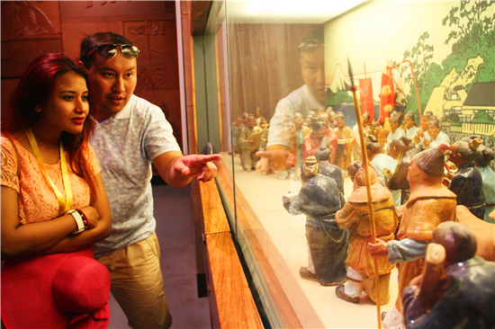 | Foreign reporters are enchanted by the vibrant and vivid clay figurines at the Penglai Ancient Ship Museum. [Photo provided to chinadaily.com.cn] |