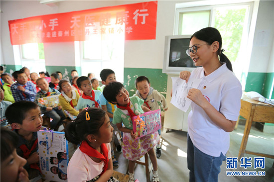 A volunteer from Tianjin Medical University describes oral health tips to pupils living in the mountainous areas of Tianshui, Gansu province on July 7. [Photo/Xinhua]