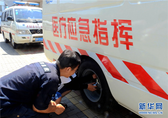 Tianjin Emergency Center staffs check an ambulance on July 10. [Photo/Xinhua]