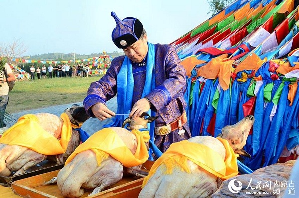 A Mongolian priest prepares mutton to sacrifice at the Aobao ritual held in Horqin Right Wing Middle Banner, Inner Mongolia autonomous region on July 6. [Photo/people.cn]