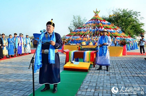 A Mongolian priest delivers a tribute at the Aobao ritual held in Horqin Right Wing Middle Banner, Inner Mongolia autonomous region on July 6. [Photo/people.cn]