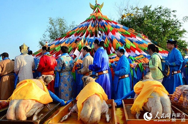 Hundreds of herdsmen circled around a cone-shaped mound called Aobao to offer livestock and libation on July 6, praying to the spirits for peace and a good harvest.