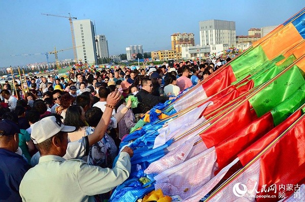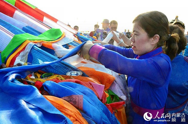 Residents offer hada at the Aobao in Horqin Right Wing Middle Banner, Inner Mongolia autonomous region on July 6. [Photo/people.cn]