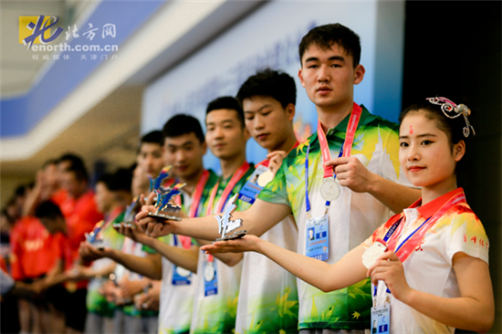 | Teams display their medals at the awards ceremony. [Photo/enorth.com.cn] |
