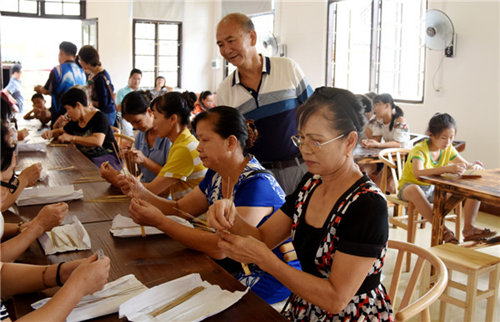 The making of Tuanshan, or round fans, was in full swing on July 9 in Yizhou, Hechi, Guangxi Zhuang autonomous region, as a summer camp kicked off at the local training center for Guangxi folk culture.