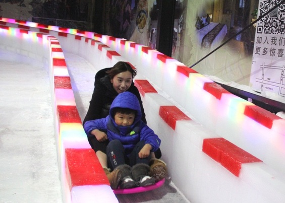 A mother races along the slide with her child. [Photo provided to China Daily]
