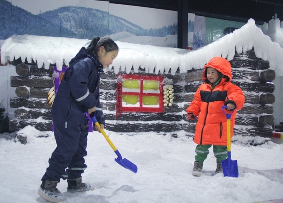 Children shovel snow to build a snowman together. [Photo provided to China Daily]