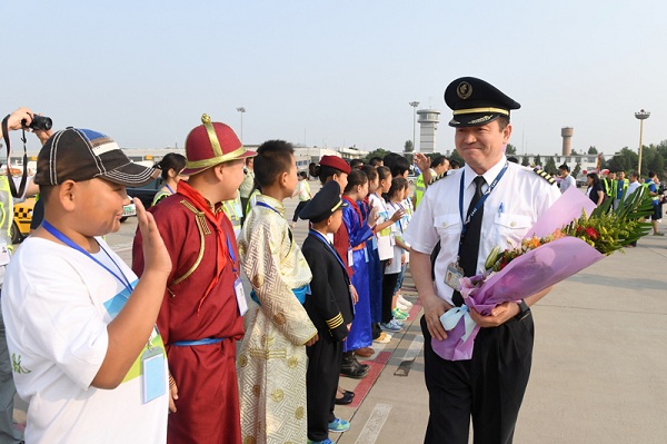Teenagers from Sonid Right Banner welcome the airplane commander at Baita International Airport in Hohhot, Inner Mongolia autonomous region on July 18. [Photo/nmgnews.com.cn]