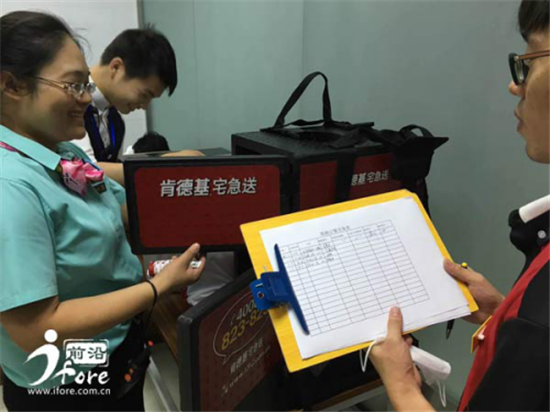 | Delivery courier gives ordered food to the staff of the 12306 distribution center. [Photo/ifore.com.cn] |