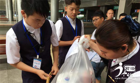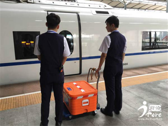 | Couriers from the 12306 distribution deliver food to train staff. [Photo/ifore.com.cn] |
