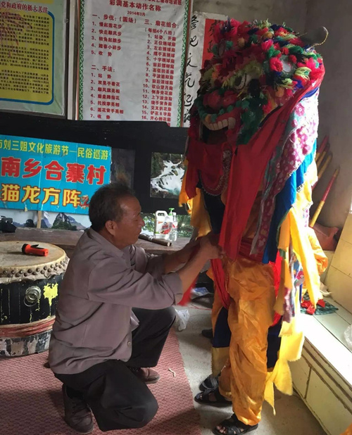 Meng Guanxin, an organizer and coach of the Maoshi dance troupe, helps a student get into costume. [Photo by Qin Shiyong, Tang Qiongfang/Hechi Daily]