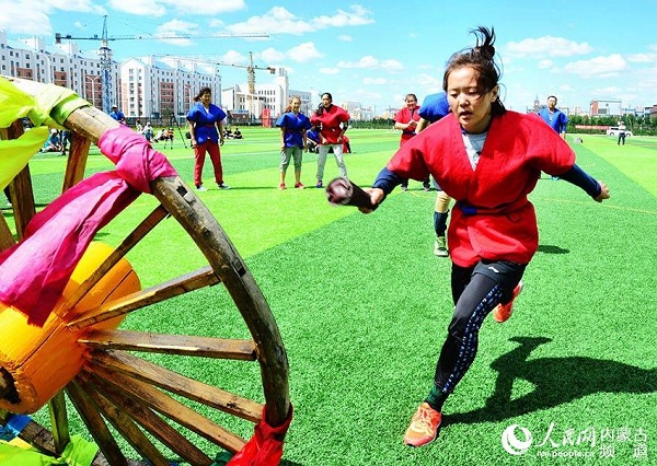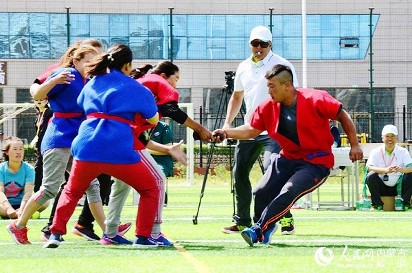 A woman succeeds in passing the pivot to her teammate during a mixed qiang shu match in Hulunbuir on July 15. [Photo/people.cn]