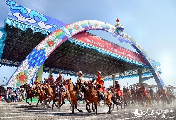 A horse parade takes place during the opening ceremony of the 7th Ulanmuchi art festival in Bairin Right Banner, Chifeng city, Inner Mongolia autonomous region on July 17. The grand gala was held to celebrate the 60th anniversary of the founding of Ulanmuchi troupe. [Photo/people.cn]