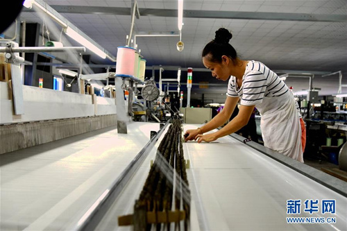 | Workers at a silk weaving workshop in Yizhou Economic Development Zone, Hechi, Guangxi Zhuang autonomous region. [Photo by Gao Dongfeng/Xinhua] |