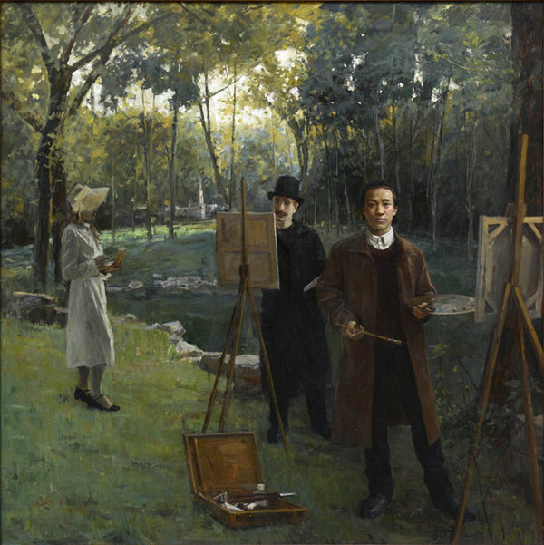 A painting featuring young Lin Fengmian (right) and his teacher was showcased at the exhibition, Baotou, Inner Mongolia, July 8, 2017. [Photo/namoc.org]