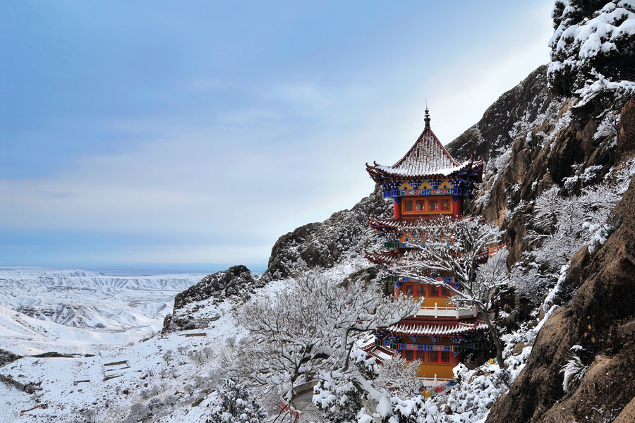 An ancient tower stands along a mountain with heavy snow covering the massive desert. [Photo provided to chinadaily.com.cn]