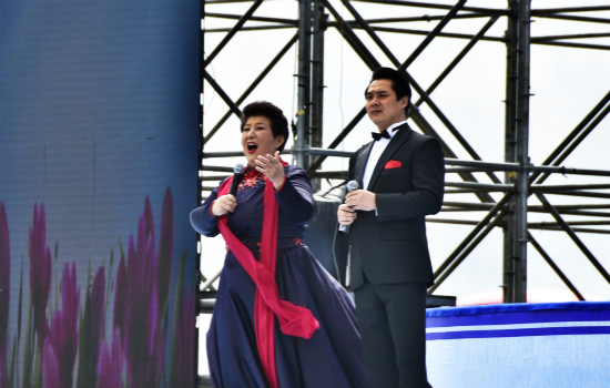 | Mongolian singers De De Ma (left) and Bao Tianbao (right) perform onstage at the opening ceremony, July 22. [Photo/people.com.cn] |
