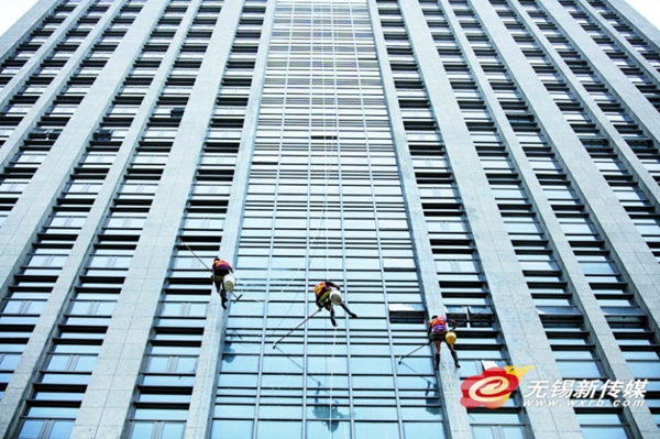| Three workers dangle high above the ground to clean the glass of a downtown Wuxi high-rise. [Photo / wxrb.com] |