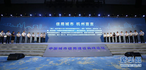 | The Summit for Credit System Construction of Chinese Cities announces a declaration aimed at building credit cities on July 18 in Hangzhou, capital of Zhejiang province. [Photo/Xinhua] |