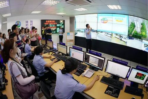 | A police officer introduces the surveillance monitoring system to a group of reporters on July 21, 2017 in Fangqian police station in Wuxi's Xinwu district. [Photo provided to chinadaily.com.cn] |
