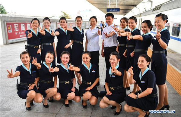 Crew members of the inter-city bullet train pose for a photo in Ulanhot station in Ulanhot of North China's Inner Mongolia autonomous region July 26, 2017.[Photo/Xinhua]