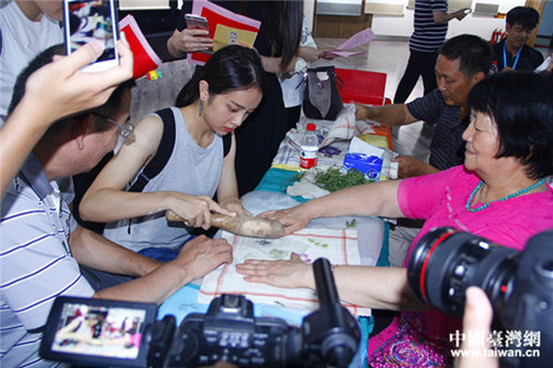 Sanmenxia craftswoman Zhu Xiuyun teaches a student the technique of chui cao yin hua, a traditional folk craft of weaving and printing with thin blades of grass, in Sanmenxia, Central China's Henan province, on July 25. [Photo by Gao Limin/taiwan.cn] |