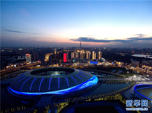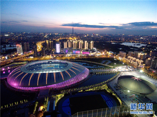 | Aerial night view of Tianjin Olympic Sports Center and Tianjin Stadium.[Photo/Xinhua] |